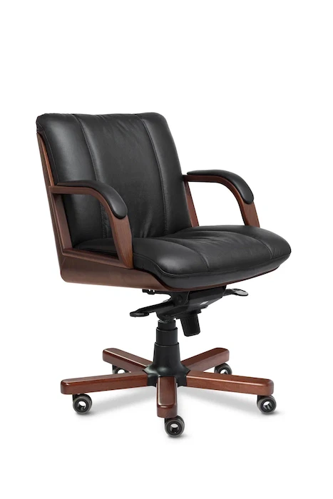 Кресло посетителя Cannes В - новая и эксклюзивная модель из натуральной кожи премиум класса, выполняется с низкой спинкой. Спинка и сидение уложены в фанерованный ковш, облицованный пластиком. Пластик - имитация текстуры ценных пород древесины. Дизайн кресла лаконичен, сочетает в себе строгость и элегантность. Кресло оборудовано механизмом качания с регулировкой под вес и фиксацией в четырёх положениях ("Мультиблок"), а так же регулировкой высоты за счет установленного в крестовине кресла газо-масляного амортизатора (газпатрона) 3-ей категории стабильности (DIN 4550 class 3), категория повышенной надёжности: газ-патрон выдерживает нагрузку в 200 тысяч циклов при динамической стендовой нагрузке в 80 кг. Максимальное давление, при котором срабатывает газ-патрон - около 150 кг. Толщина поролона на сиденье и на спинке 45 мм. Применяемая марка поролона 30/40 (плотность/жесткость) обеспечивает долговечность кресла. Каркас кресла выполнен из высокопрочной гнутоклееной фанеры. Чехол кресла выполнен из черной или цветной мебельной, натуральной кожи сквозного крашения со среднезернистым тиснением из цельных шкур крупного рогатого скота, задняя часть спинки по евростандарту из кожзама (компаньона) в цвет кожи. Толщина шкуры в стандартной точке 0,9-1,1мм. Также чехол может быть выполнен из экокожи ("Орегон") или микровелюра. Для придания объемности и правильной эргономики чехла кресла - применяется холофайбер ( марка 400). Спинка и сидение имеют прямые вертикальные и горизонтальные прострочки, образуя стильные прямоугольные ячейки. Все указанные материалы экологичные и износостойкие. Подлокотники кресла изготовлены из массива древесины с накладками, обтянутыми натуральной кожей. Подлокотники имеют пластиковое покрытие. Пластик - имитация текстуры ценных пород древесины. Крестовина металлическая сварная из профильной трубы 25*25 выдерживает нагрузку до 130 кг, лучи крестовины закрыты декоративными накладками из массива бука. С лицевой стороны накладки имеют пластиковое покрытие. Пластик - имитация текстуры ценных пород древесины. Ролики - паркетные прорезиненные (обеспечивают сохранность паркета, ламината). Каждый ролик рассчитан на нагрузку в 30 кг.