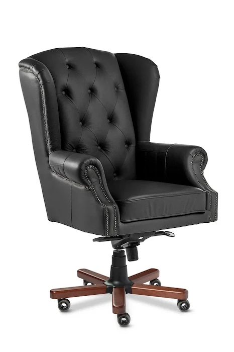 Кресло руководителя Gent - в классическом английском стиле из категории бизнес-хоум-премиум. Выполняется с высокой спинкой, подлокотниками-валиками на подвижной роликовой крестовине, облаченной в тонированные деревянные накладки из массива бука. Декорировано молдингами из гвоздевой ленты - Bronze Renaissance (бронза ренессанс). Спинка имеет декоративные утяжки с пуговицами, в виде больших вертикально вытянутых ромбов, и по бокам снабжена, расширяющимися в верх, мягкими экранами боковой поддержки ("уши"), что создаёт дополнительный комфорт. Кресло отлично вписывается в классический интерьер как домашнего, так и офисного кабинета. Каркас кресла изготовлен из фанеры берёзы и бруса сосны с проклейкой узлов сопряжения. Подлокотники, спинка и сидение кресла составляют единую целостную конструкцию и изготавливаются в ручную методом поэтапной сборки. Кресло имеет эргономичные изгибы: для спинки – в вертикальном направлении под поясничную область; для сиденья – в вертикальном и горизонтальном направлении в двух плоскостях. По бокам спинки расположены, расширяющиеся к верху, экраны боковой поддержки ("уши"), так же являющиеся частью каркаса. Толщина поролона сиденья 90 мм, спинки 60 мм. Применяемая марка поролона 30/40 (плотность/жесткость) обеспечивает долговечность кресла. В сидение и спинку вмонтированы пружины-змейки (в спинку - 4 шт., в сидение - 3 шт.), что создаёт дополнительную упругость, увеличивает износостойкость и срок эксплуатации. Кресло оборудовано механизмом качания с регулировкой под вес и фиксацией в четырёх положениях - "Мультиблок", а так же регулировкой высоты за счет установленного в крестовине кресла газо-масляного амортизатора (газпатрона) 3-ей категории стабильности (DIN 4550 class 3), категория повышенной надёжности: газпатрон выдерживает нагрузку в 200 тысяч циклов при динамической стендовой нагрузке в 80 кг. Минимальное давление, при котором срабатывает газпатрон - 21,5 кг, максимальное - около 150 кг. Чехол кресла выполнен из черной или цветной мебельной, натуральной кожи сквозного крашения со среднезернистым тиснением из цельных шкур крупного рогатого скота, задняя часть спинки по евростандарту из кожзама (компаньона) в цвет кожи. Толщина шкуры в стандартной точке 0,9-1,1мм. Чехол кресла с лицевой стороны на спинке имеет утяжки в виде больших, вертикально вытянутых ромбов по всей поверхности. Утяжки выполнены с применением пуговиц, обтянутых экокожей. Сидение кресла - гладкое, с наклоном назад, не имеет утяжек и прострочек. Все применяемые в изготовлении материалы экологичные и износостойкие. Крестовина металлическая сварная из профильной трубы 25*25*1,5 мм выдерживает нагрузку до 150 кг, лучи крестовины закрыты декоративными накладками из массива бука, тонированных и покрытых шелковисто матовым полиуретановым лаком (производство Италия) в несколько слоев. Ролики - паркетные прорезиненные (обеспечивают сохранность паркета, ламината). Каждый ролик рассчитан на нагрузку в 30 кг.