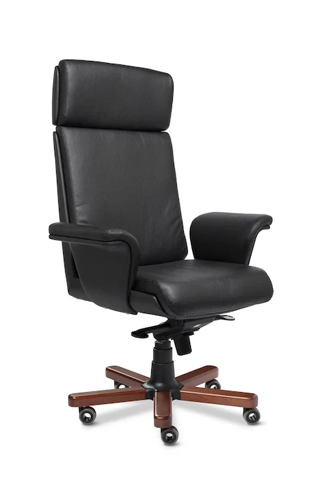 Кресло руководителя Split A - новая и эксклюзивная модель из натуральной кожи премиум класса, выполняется с высокой спинкой и удобным подголовником. Спинка и сидение уложены в фанерованный ковш, с внешней стороны обтянутый высококачественным кожзаменителем. Дизайн кресла лаконичен, сочетает в себе строгость и элегантность. Кресло оборудовано механизмом качания с регулировкой под вес и фиксацией в четырёх положениях ("Мультиблок"), а так же регулировкой высоты за счет установленного в крестовине кресла газо-масляного амортизатора (газпатрона) 3-ей категории стабильности (DIN 4550 class 3), категория повышенной надёжности: газпатрон выдерживает нагрузку в 200 тысяч циклов при динамической стендовой нагрузке в 80 кг. Максимальное давление, при котором срабатывает газпатрон - около 150 кг. Толщина поролона на сиденье и на спинке 80 мм. Применяемая марка поролона 30/40 (плотность/жесткость) обеспечивает долговечность кресла. Каркас кресла выполнен из высокопрочной гнутоклееной фанеры. Чехол кресла выполнен из черной или цветной мебельной, натуральной кожи сквозного крашения со среднезернистым тиснением из цельных шкур крупного рогатого скота, задняя часть спинки по евростандарту из кожзама (компаньона) в цвет кожи. Толщина шкуры в стандартной точке 0,9-1,1мм. Также чехол может быть выполнен из экокожи ("Орегон") или микровелюра. Для придания объемности и правильной эргономики чехла кресла - применяется холофайбер ( марка 400). Спинка и сидение гладкие, не имеют строчек или утяжек. Все указанные материалы экологичные и износостойкие - высшего качества. Подлокотники кресла изготовлены из гнутоклееной фанеры, с внутренней стороны и сверху имеют мягкую накладку-подушку, обтянутую натуральной кожей в цвет чехла кресла. Крестовина металлическая сварная из профильной трубы 25*25*1,5 мм выдерживает нагрузку до 150 кг, лучи крестовины закрыты декоративными накладками из массива бука, тонированных и покрытых шелковисто матовым полиуретановым лаком (производство Италия) в несколько слоев. Ролики - паркетные прорезиненные (обеспечивают сохранность паркета, ламината). Каждый ролик рассчитан на нагрузку в 30 кг.