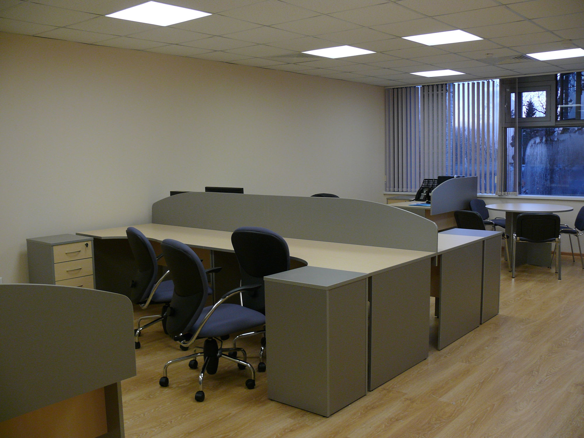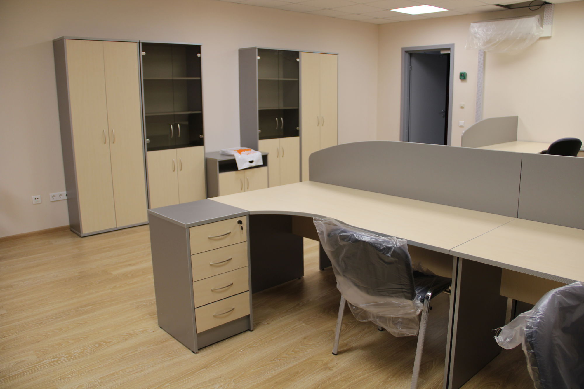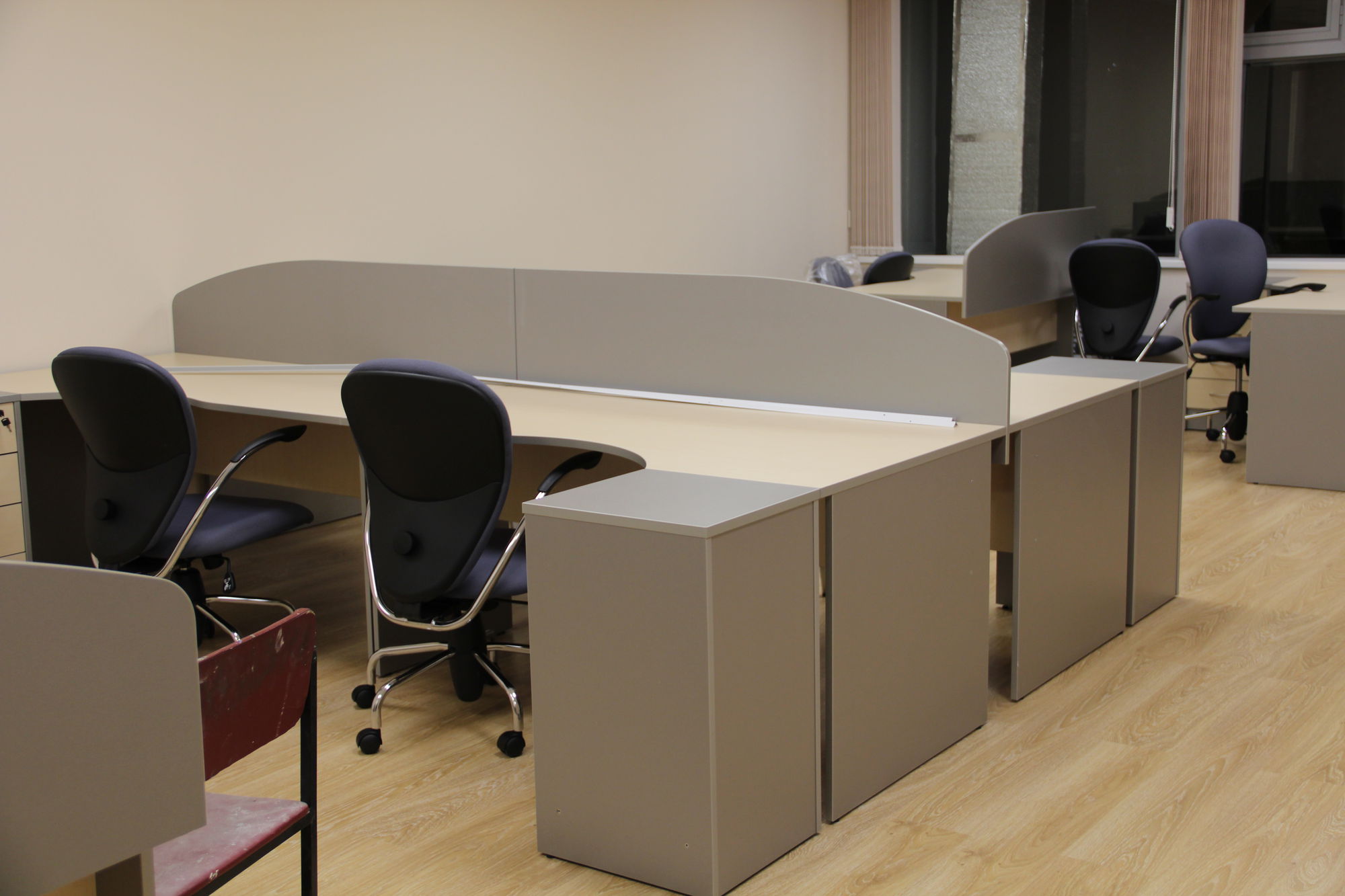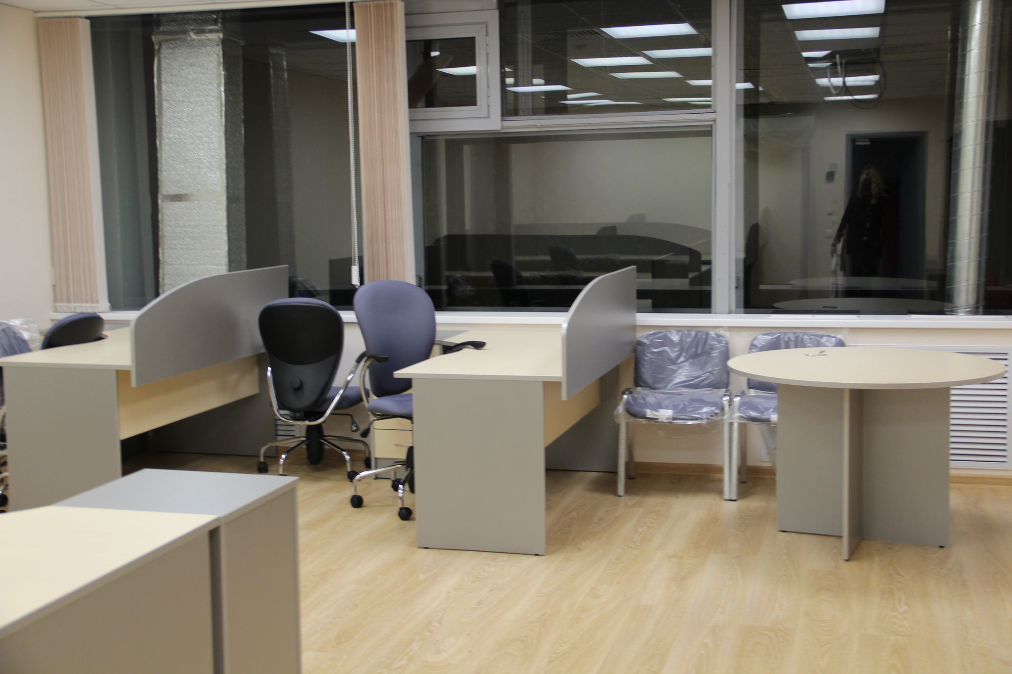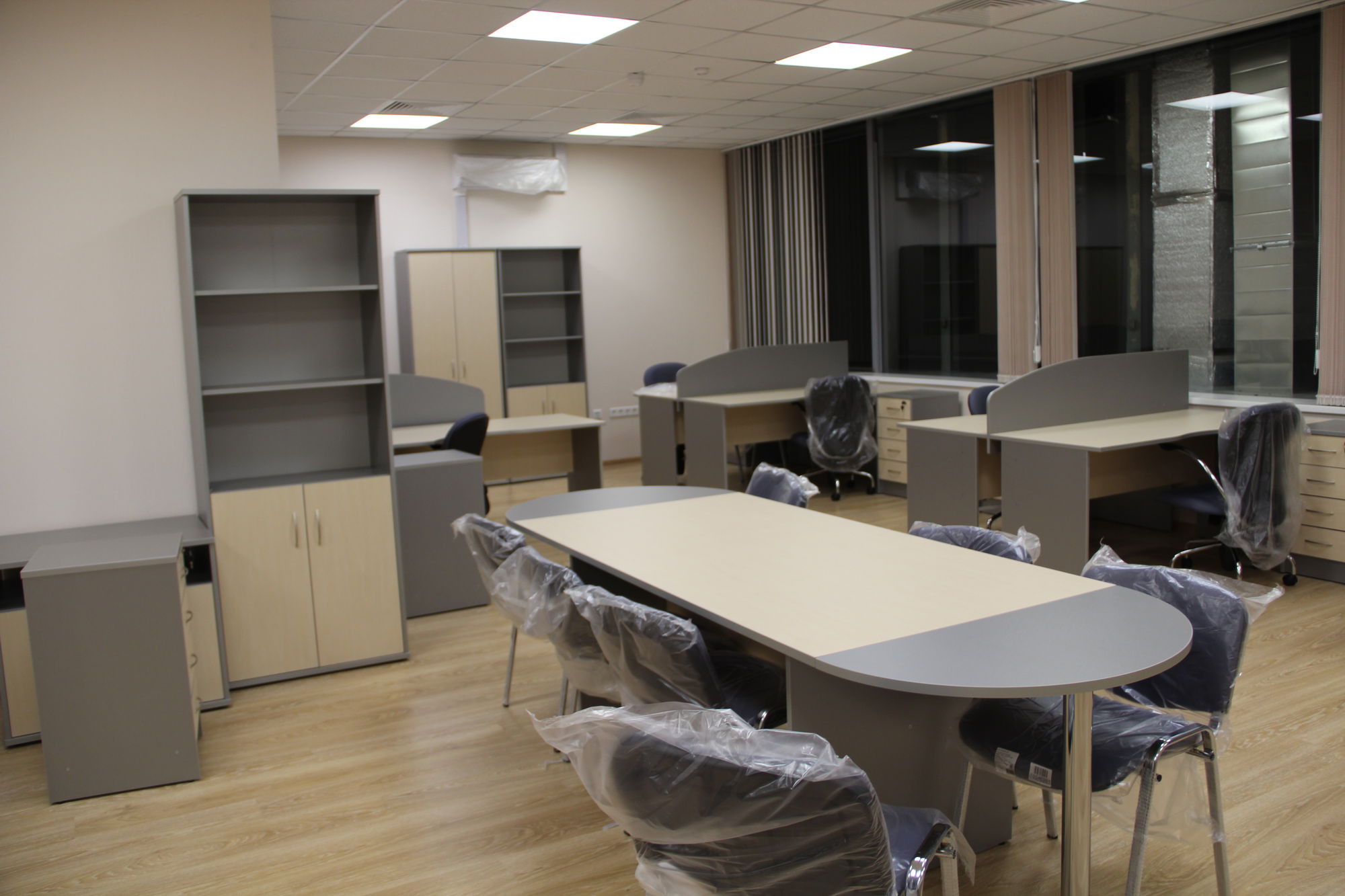 Произведена отгрузка и сборка более 70 рабочих мест для сотрудников офисной мебели Имаго (клен-металлик) белоруской фабрики Скайлэнд, кресла фабрики Тайпит. Несколько кабинетов руководителя Ревенгтон, фабрики Сторосс. Организованы мягкие зоны из офисных диванов Бисмарк – изготовитель Кенигсберг. Переговорный стол I-meet (Италия). Собраны металлические стеллажи и шкафы для раздевалок фабрики Промет. А так же жалюзи всевозможных расцветок.