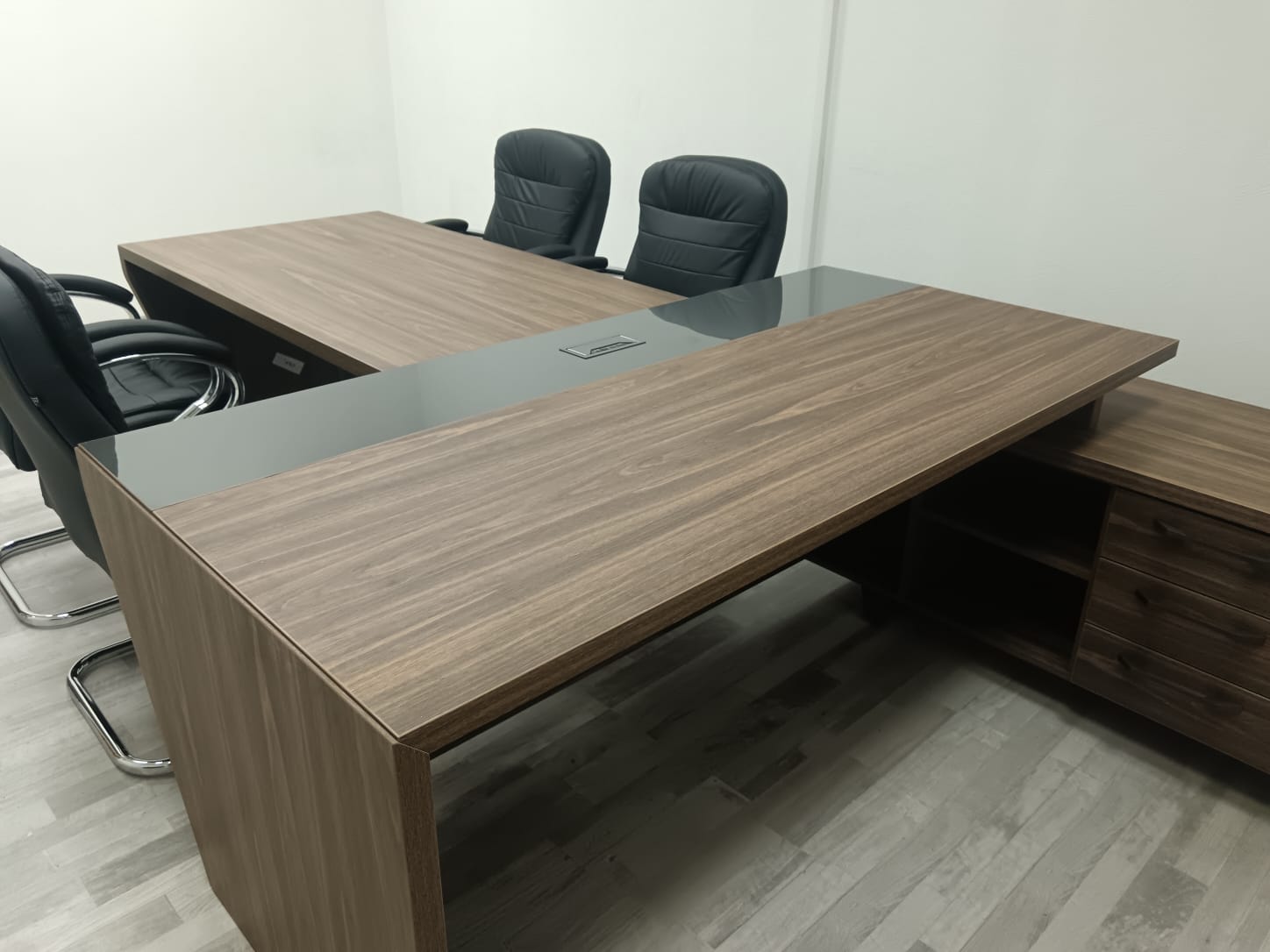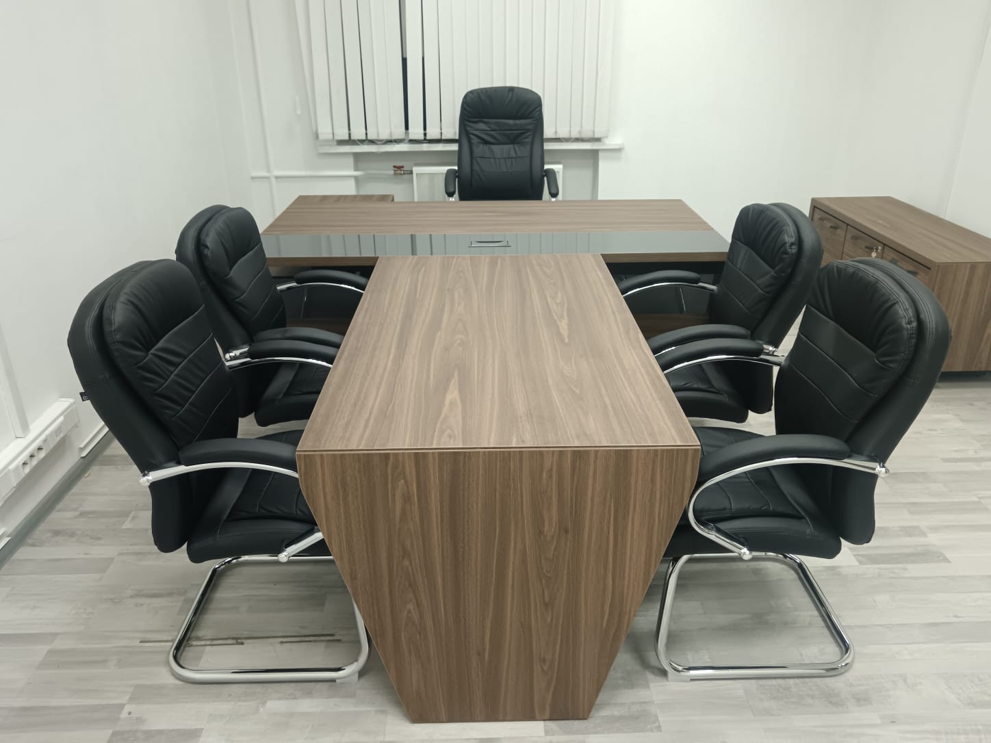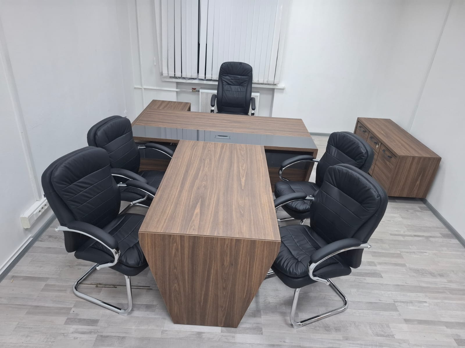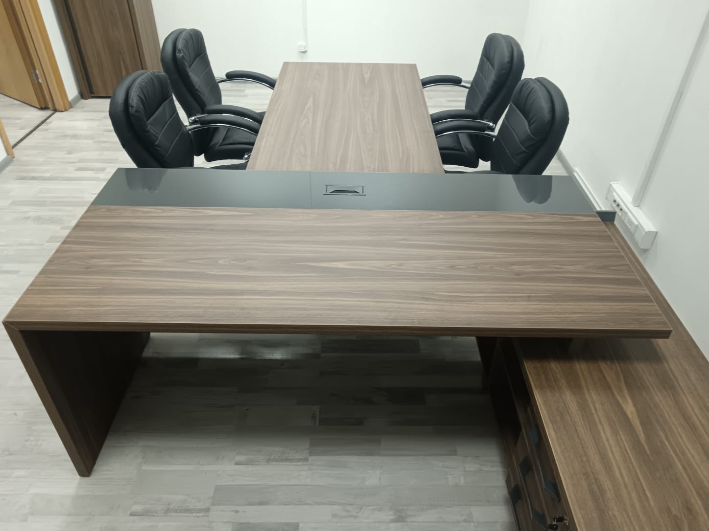 В проекте использован кабинет руководителя "Corner" в цвете ;"Орех Лоренцо/Графит" и мебель для персонала "Onix" в цвете "Дуб Мали/Антрацит"