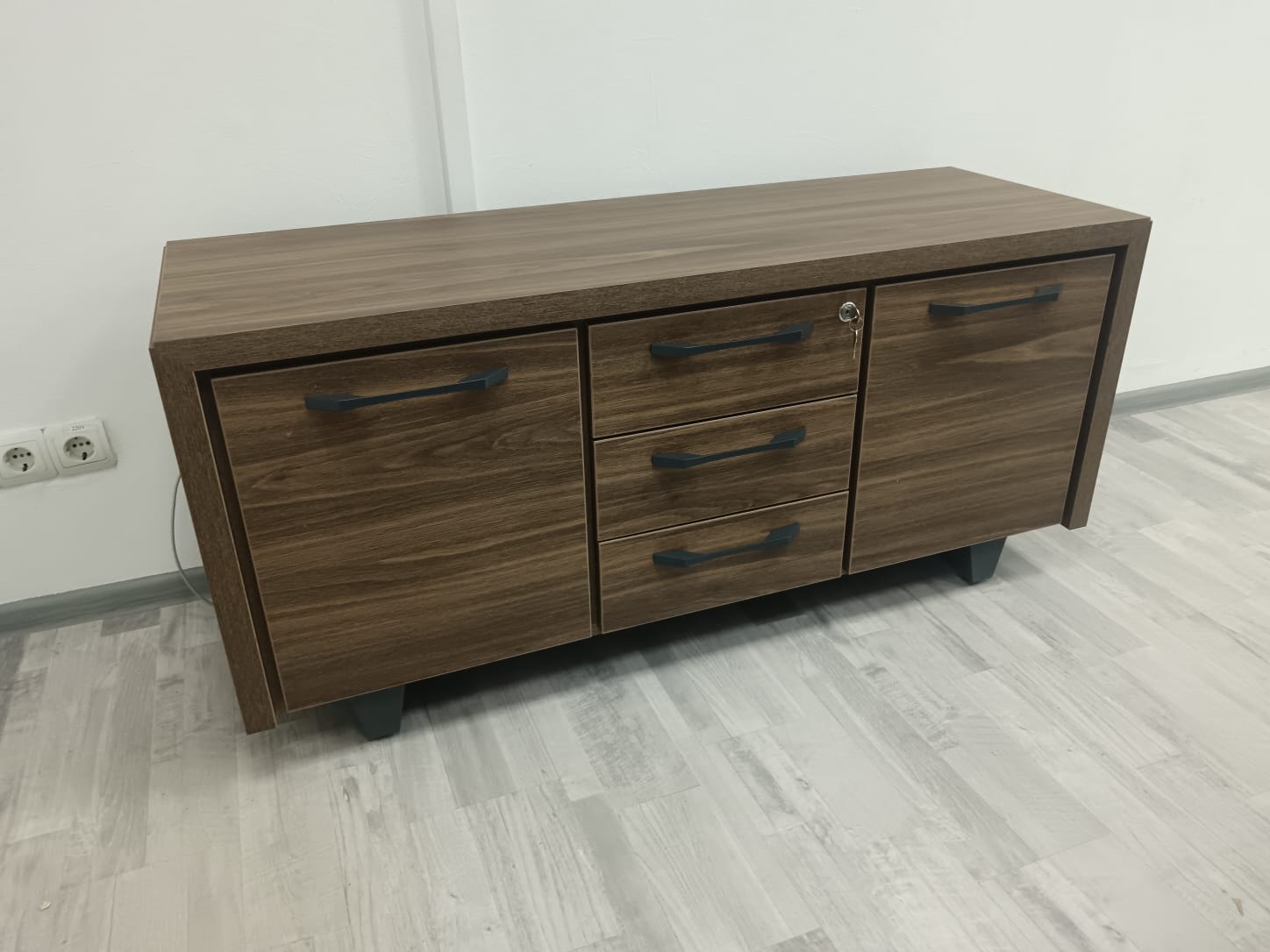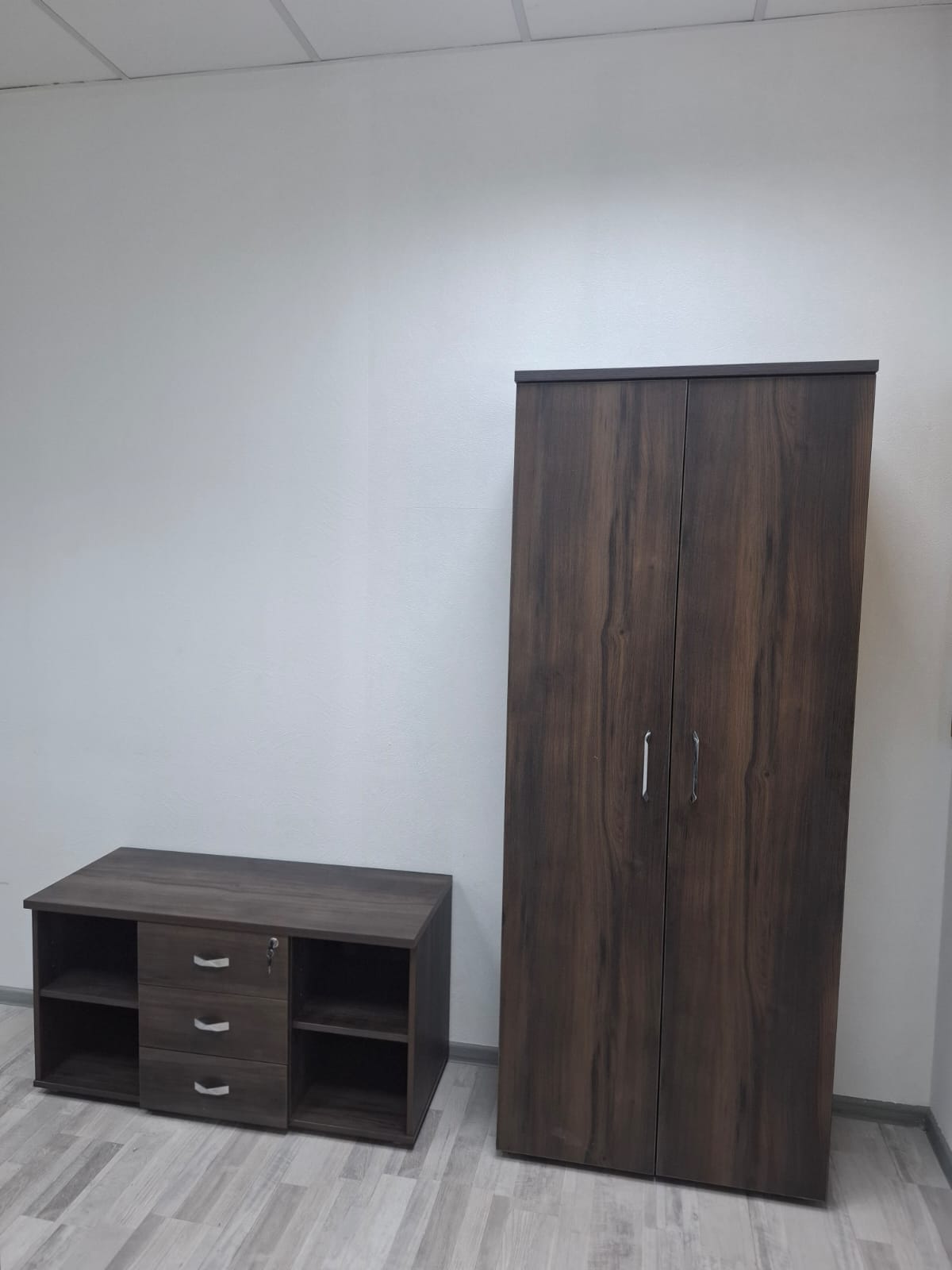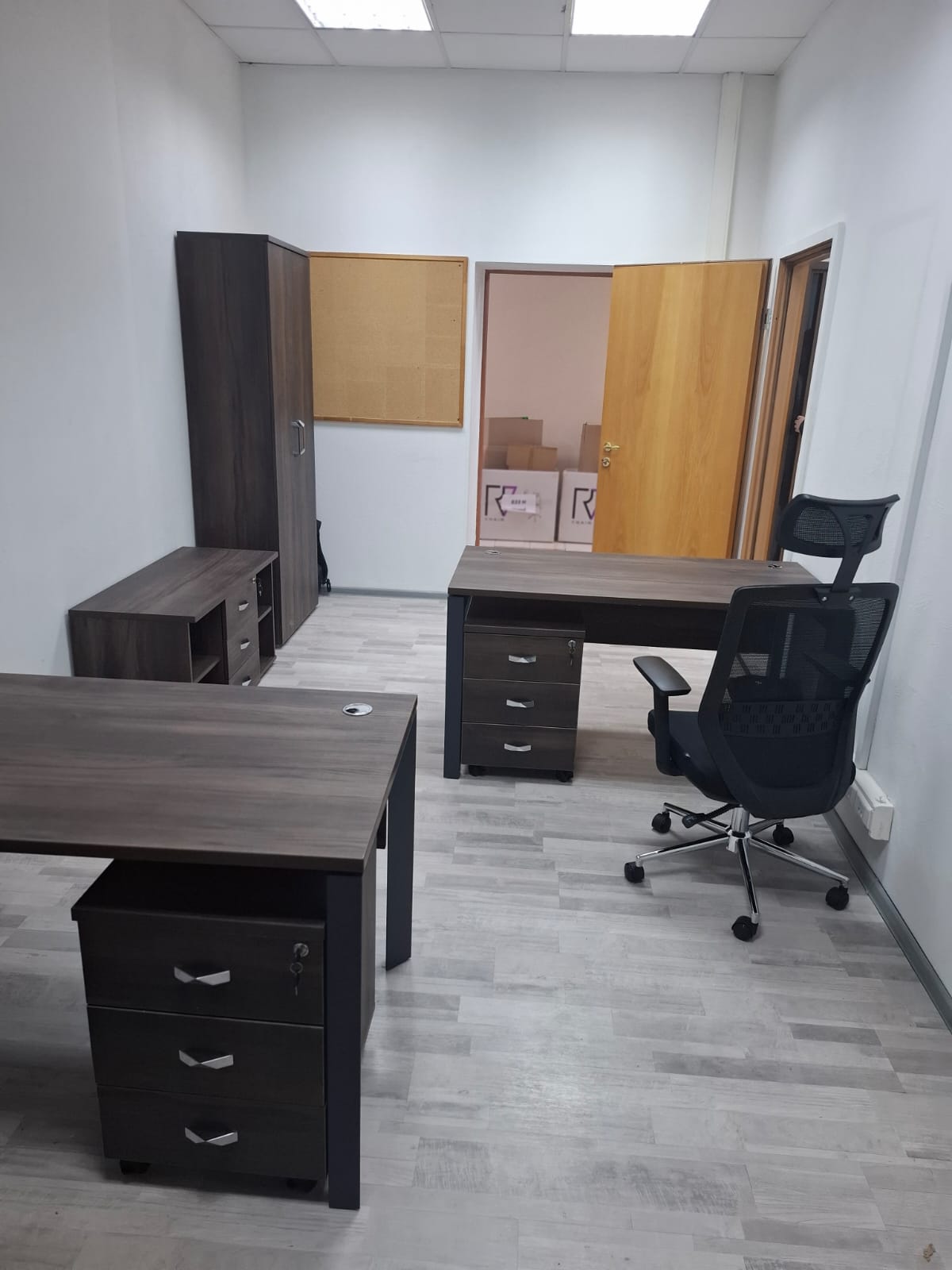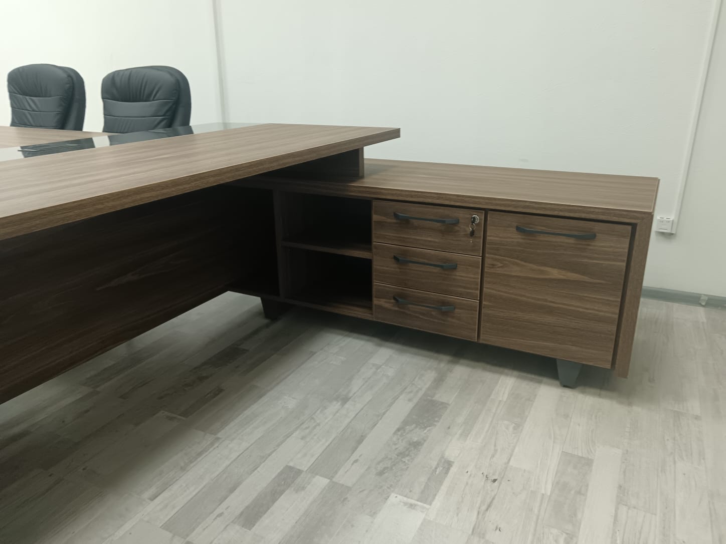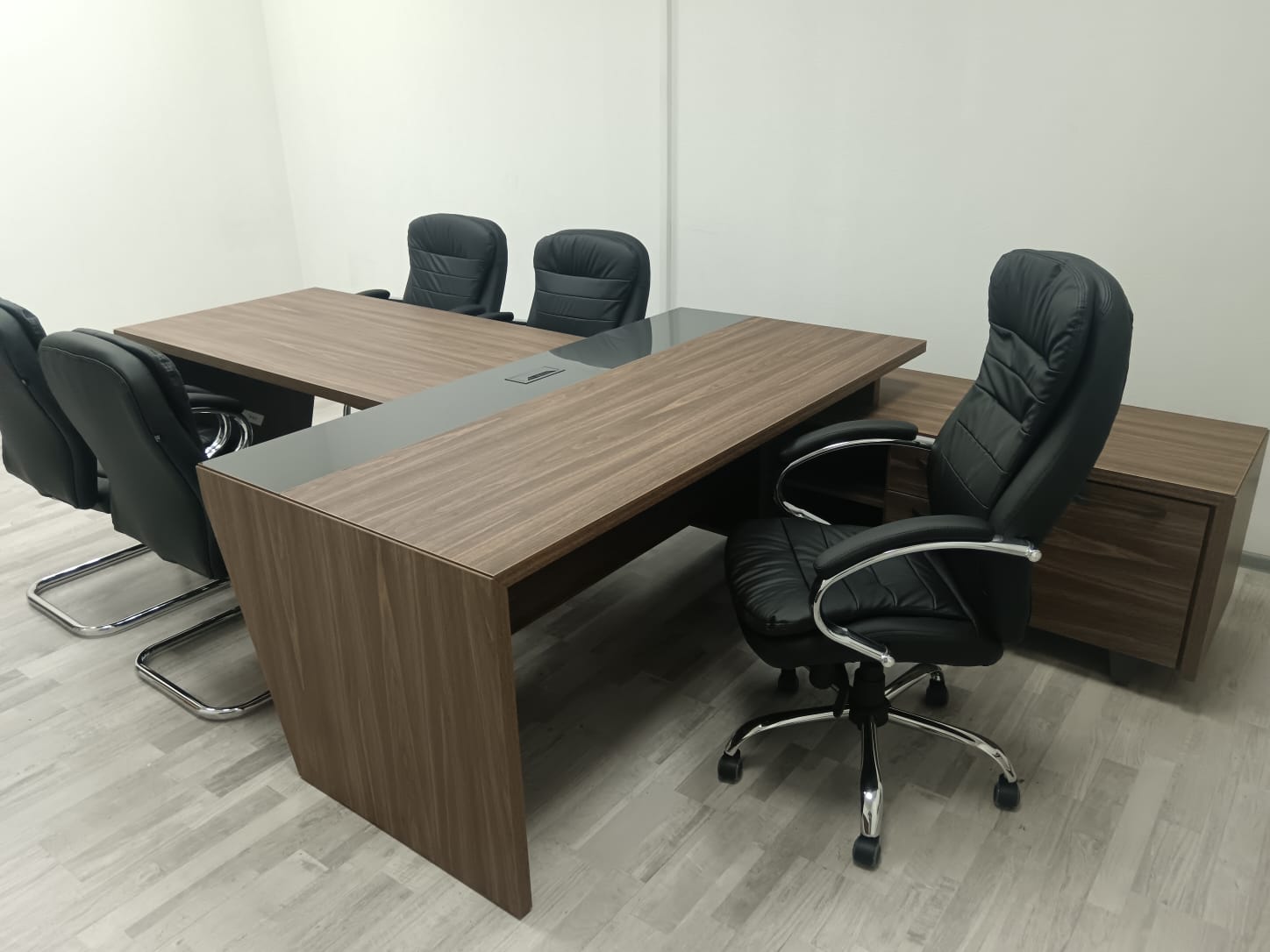 В проекте использован кабинет руководителя "Corner" в цвете ;"Орех Лоренцо/Графит" и мебель для персонала "Onix" в цвете "Дуб Мали/Антрацит"