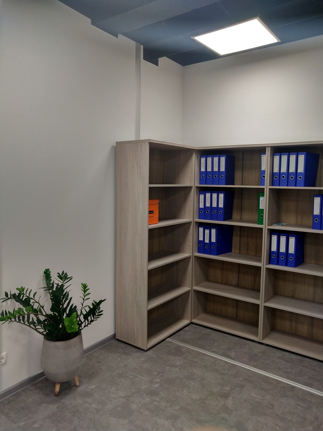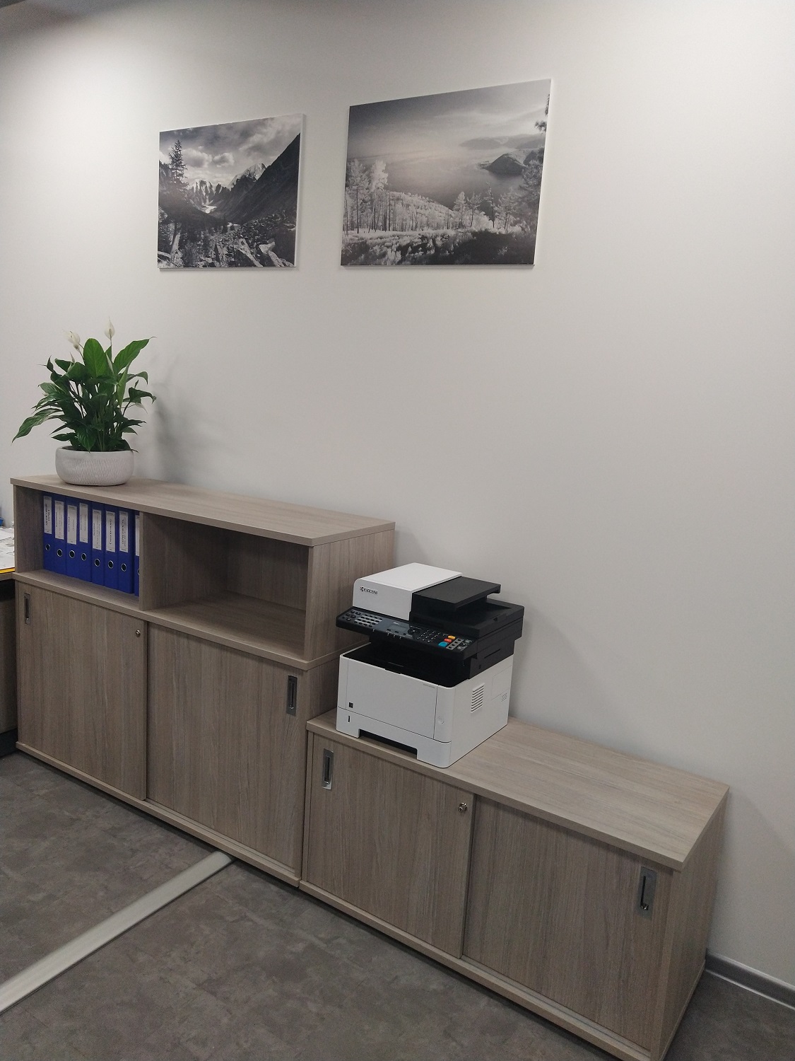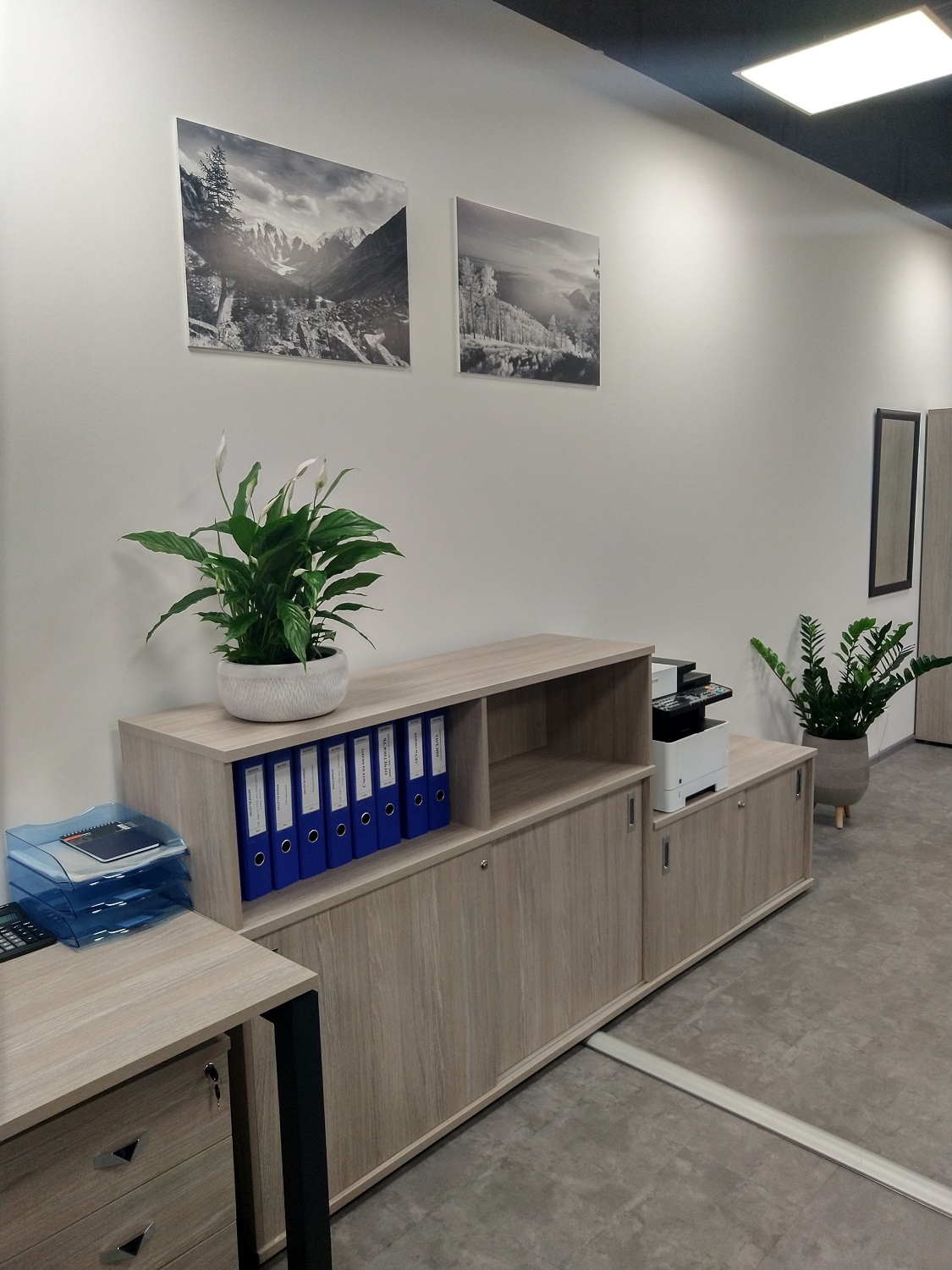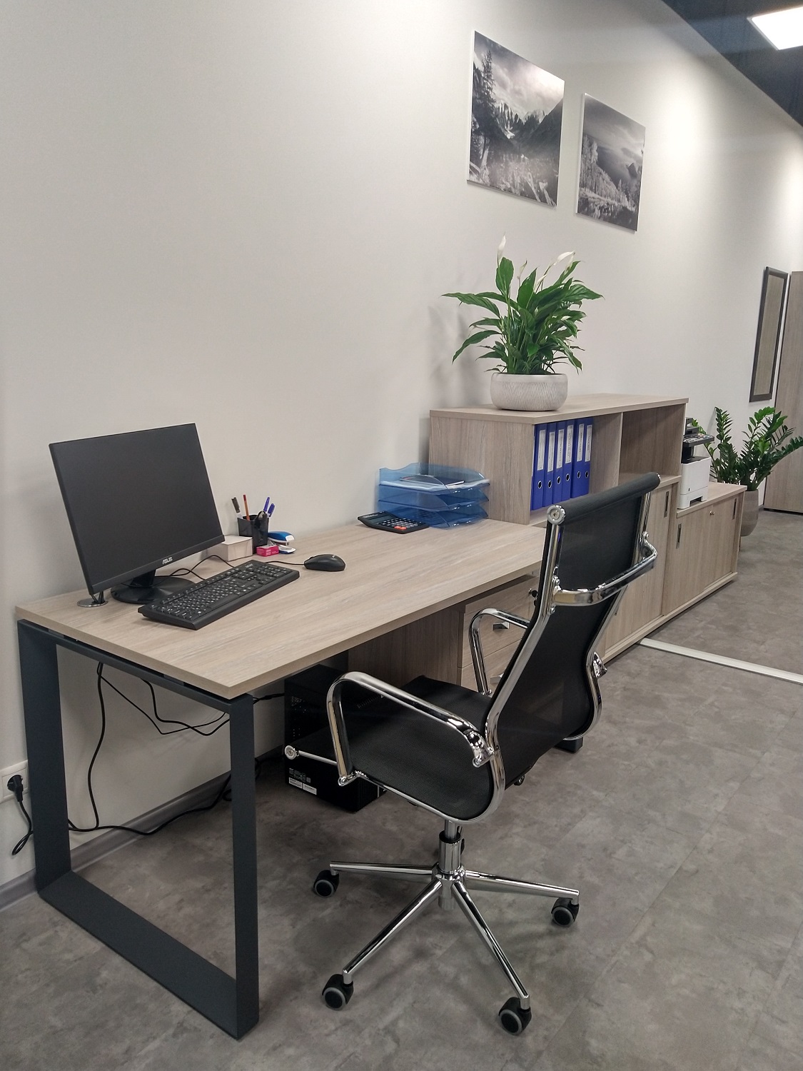 Для обустройства рабочих мест сотрудников данной компании мы выбрали элементы из серииONIX и RIVA. На первый взгляд, может показаться, что данные модели мало чем схожи, но, когда все было собрано, вся картина нашей задумки прояснилась. Элементы серии отлично дополняли друг друга. Были выбраны такие элементы, как различные вариации столов, тумбы, шкафы, стеллажи, комоды и так далее. Дополнили рабочие места мы с помощью кресел для персонала серии Opera от фабрики Everprof.