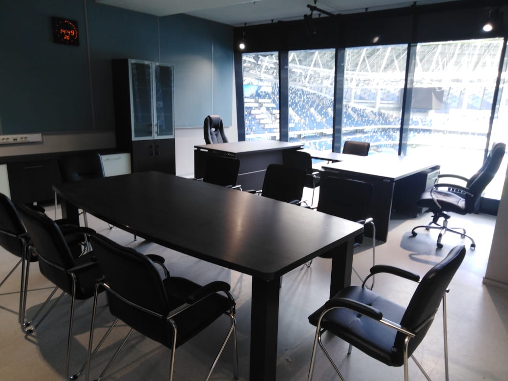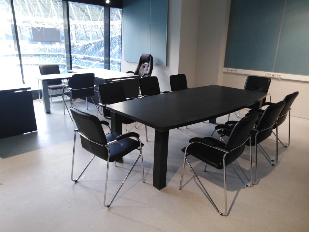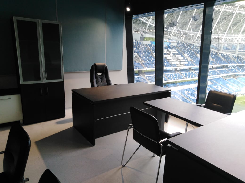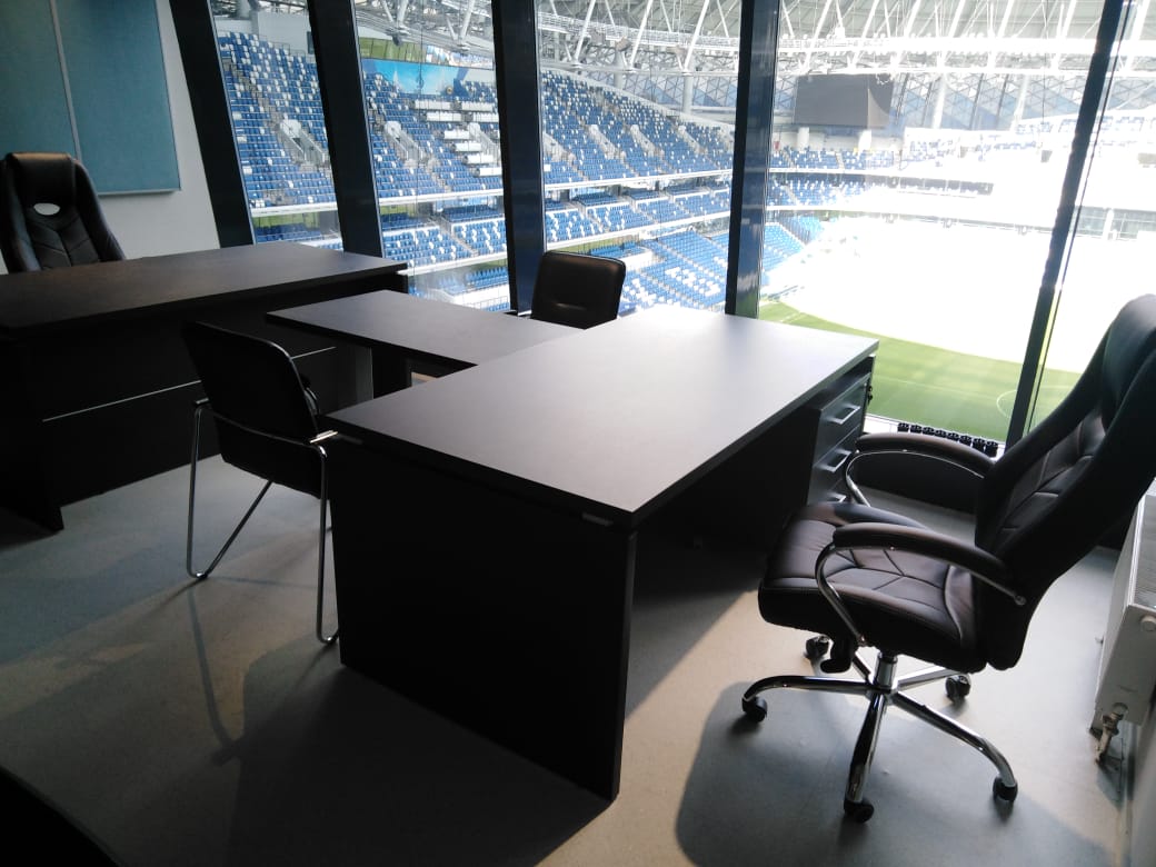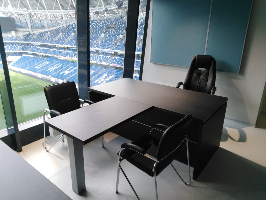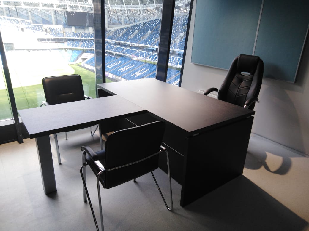 В нашу компанию «Офисная Мебель АЛЬФА-М» поступил заказ оформления кабинета в спортивном и концертно-развлекательном комплексе «ВТБ Арена — Центральный стадион «Динамо». Мебель из серии Yalta отлично вписалась в интерьер небольшого кабинета с видом на стадион. Данная модель выполнена в насыщенном цвете — Суар темный от фабрики Рива. Помимо этого, нами была организована поставка кресел для руководителей модели Drift M от фабрики Everproff. А стулья для посетителей являлись собственностью заказчика.